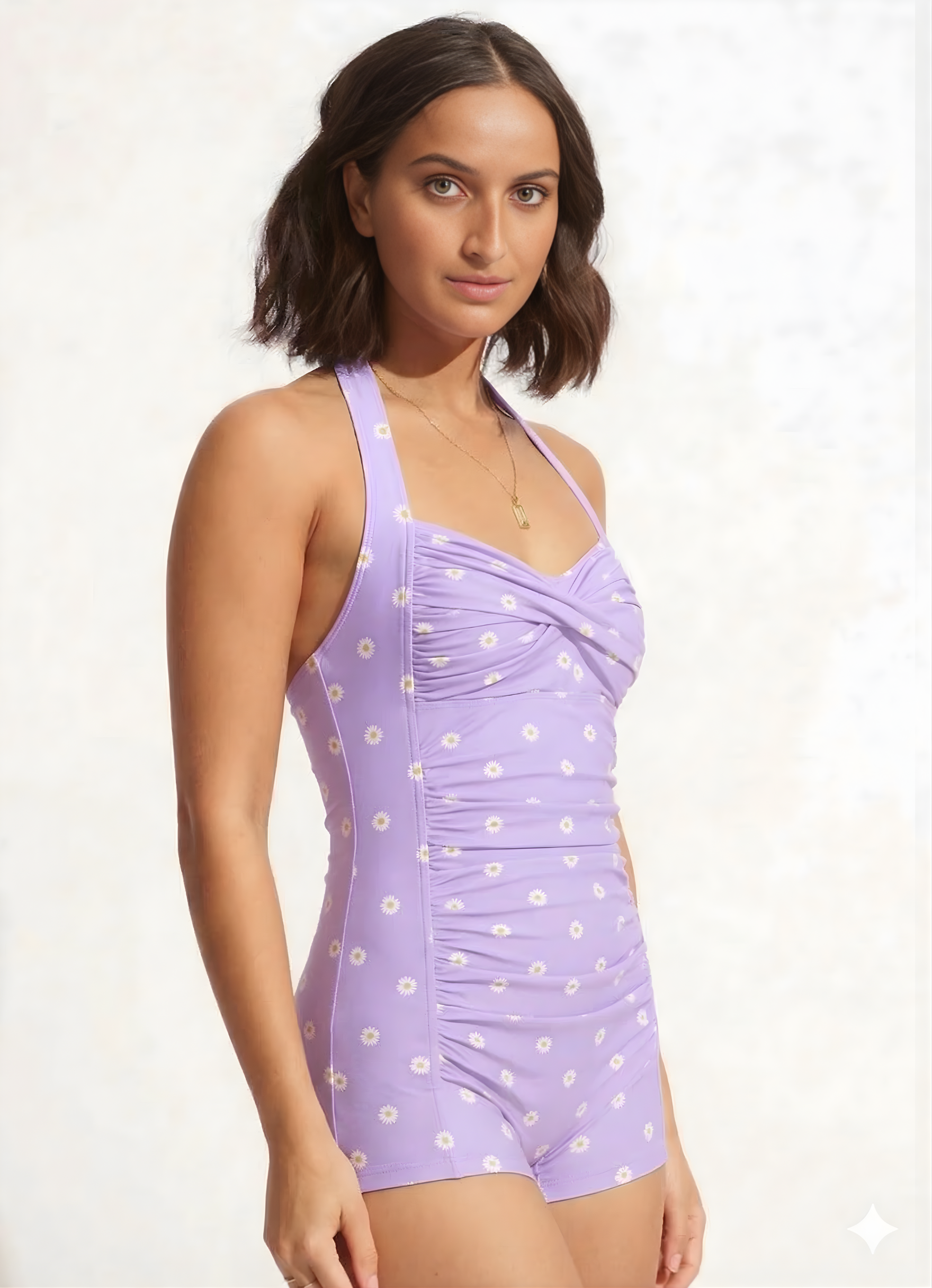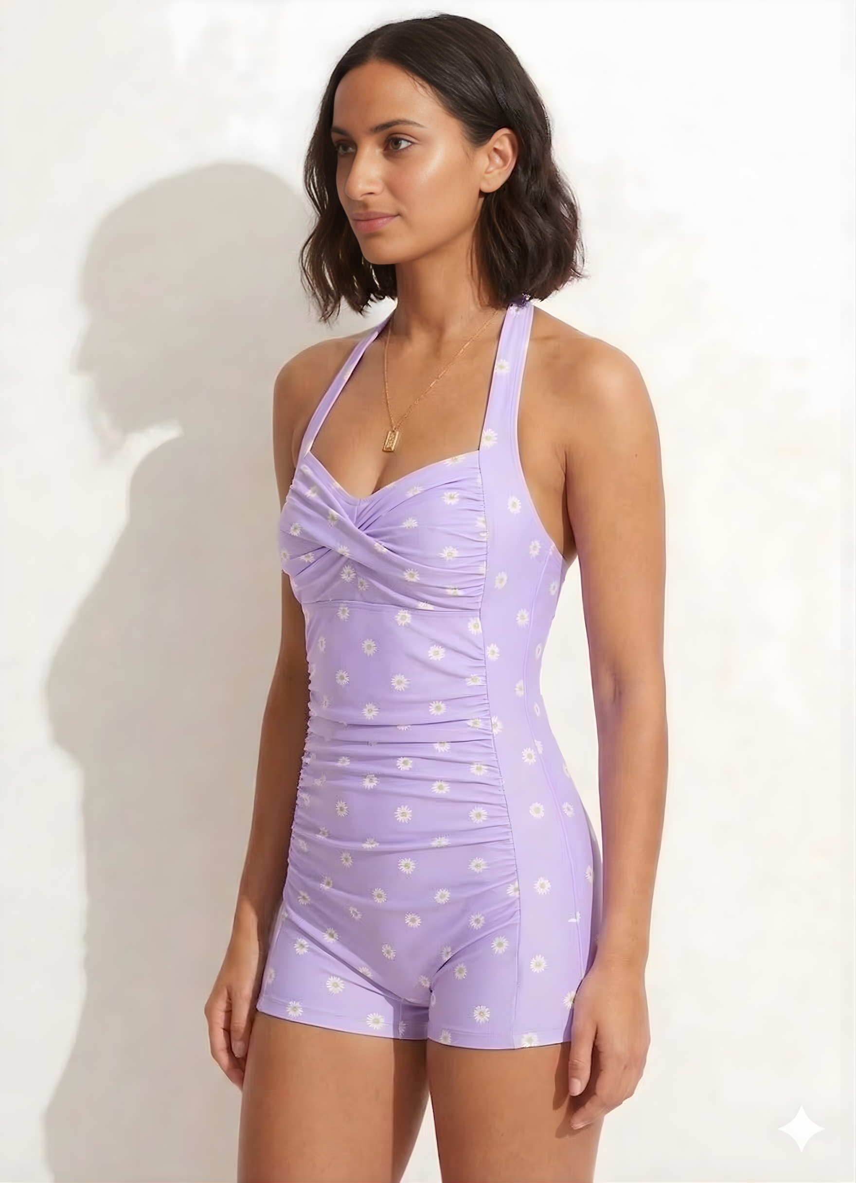 Bold Curve Printed Padded Lavender Daisy One Piece Swimsuits Tummy Ruffle Control High Waisted Swimwear Full Coverage Short